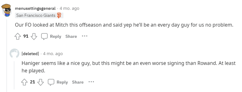 Mariners fans and Giants fans alike gave their sharp-tongued opinions of Haniger when this graphic was posted on Reddit: