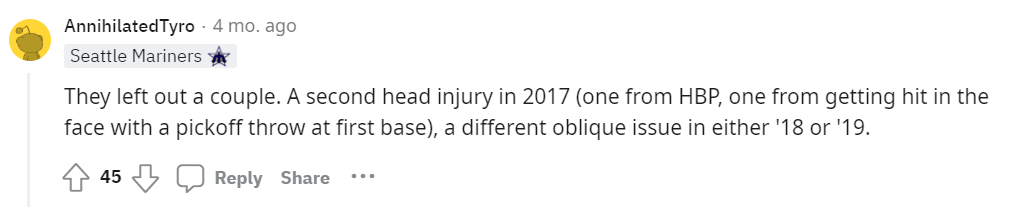 However, the more I searched and searched through Haniger’s extensive injury history, the more I realized something, and the more it dawned on me that I couldn’t ignore. Then, I found one more comment, the most salient one on the entire Reddit thread.