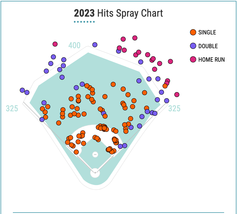 Naylor’s spray chart shows balls sent to all part of the field, but his power to the pull side. Without standout raw power, most of his homers are going to come on pulled fly balls that seem to not be his main focus. Naylor’s more old school hitting approach led him to hit .308 in 2023 after posting a mid .250s batting average the two seasons prior. xBA also backed this up, coming in at .293 after .254 and .257 in ’22 and ’21.