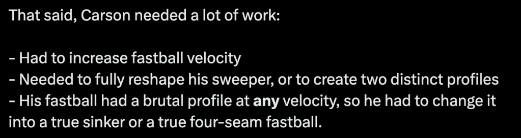Ashcraft was finally able to log a full season in 2023 in which he made 19 starts but threw just 52.2 innings. Ashcraft has thrown in 3.2 innings so far in Spring Training, and the pitch shapes are promising. His fastball has averaged 96.6 mph with 16.6 IVB and 7.8 HB. Ashcraft’s most interesting pitch is his slider, which has averaged at 89.5 mph with 3.9 IVB and -1.9 HB. This is a very hard gyro slider which averages around the same velo as Bobby Miller and Sandy Alcantara’s sliders.