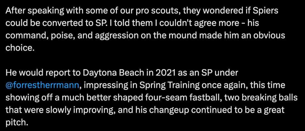 When Spiers was brought to Cincinnati, Kyle Boddy was the team’s Minor League Director of Pitching Initiatives/Pitching Coordinator. While Boddy and the Reds mutually parted ways at the end of the 2021 season, Spiers continued to be a player he advocated for on Twitter. The below screenshots all come from a thread Boddy wrote about Spiers right before he was called up to the majors in September, linked here.