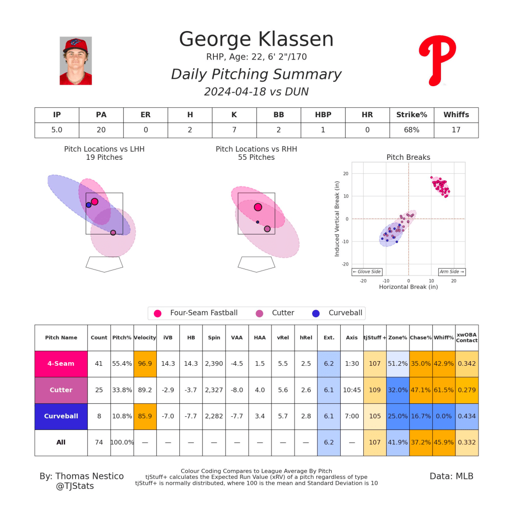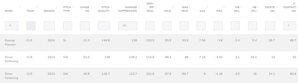 This hard cutter/slider is an equally interesting pitch because of the high velo and it’s ability to create swing and miss. It’s whiff rate has been over 50% in each of his three starts, and Robert Orr from Baseball Prospectus noted his pitch model rated it higher than Orion Kerkering’s sweeper.