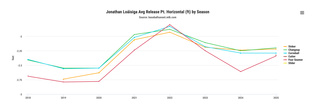 Loáisiga’s arm angle has changed massively since he came into the league. His vertical, how high he releases, has dropped lower and lower, while his horizontal, how side-to-side he released, spiked closer to his body in his best years and went back further out in his worst.